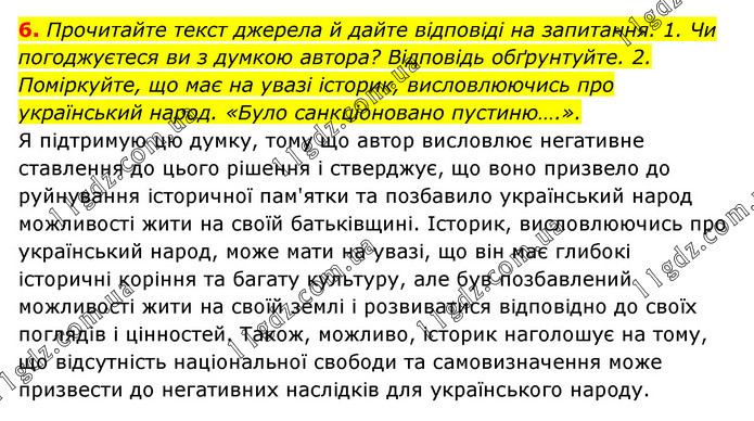 Прочитайте текст джерела й дайте відповіді на запитання. 1. Чи погоджуєтеся ви з думкою автора? Відповідь обґрунтуйте. 2. Поміркуйте, що має на увазі історик, висловлюючись про український народ. «Було санкціоновано пустиню….». Я підтримую цю думку, тому що автор висловлює негативне ставлення до цього рішення і стверджує, що воно призвело до руйнування історичної пам'ятки та позбавило український народ можливості жити на своїй батьківщині. Історик, висловлюючись про український народ, може мати на увазі, що він має глибокі історичні коріння та багату культуру, але був позбавлений можливості жити на своїй землі і розвиватися відповідно до своїх поглядів і цінностей. Також, можливо, історик наголошує на тому, що відсутність національної свободи та самовизначення може призвести до негативних наслідків для українського народу.