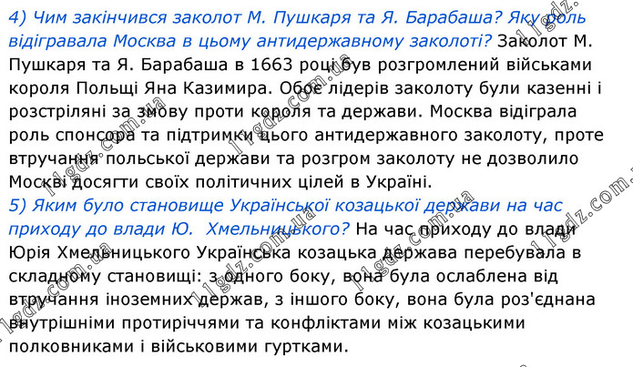 4) Чим закінчився заколот М. Пушкаря та Я. Барабаша? Яку роль відігравала Москва в цьому антидержавному заколоті? Заколот М. Пушкаря та Я. Барабаша в 1663 році був розгромлений військами короля Польщі Яна Казимира. Обоє лідерів заколоту були казенні і розстріляні за змову проти короля та держави. Москва відіграла роль спонсора та підтримки цього антидержавного заколоту, проте втручання польської держави та розгром заколоту не дозволило Москві досягти своїх політичних цілей в Україні. 5) Яким було становище Української козацької держави на час приходу до влади Ю. Хмельницького? На час приходу до влади Юрія Хмельницького Українська козацька держава перебувала в складному становищі: з одного боку, вона була ослаблена від втручання іноземних держав, з іншого боку, вона була роз'єднана внутрішніми протиріччями та конфліктами між козацькими полковниками і військовими гуртками.