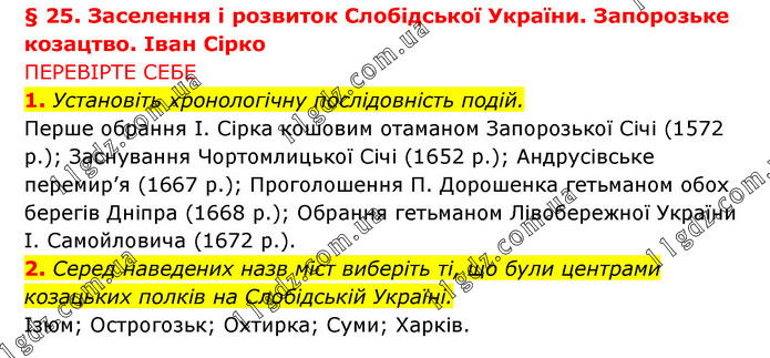 § 25. Заселення і розвиток Слобідської України. Запорозьке козацтво. Іван Сірко ПЕРЕВІРТЕ СЕБЕ 1. Установіть хронологічну послідовність подій. Перше обрання І. Сірка кошовим отаманом Запорозької Січі (1572 р.); Заснування Чортомлицької Січі (1652 р.); Андpусiвське перемир’я (1667 р.); Проголошення П. Дорошенка гетьманом обох берегів Дніпра (1668 р.); Обpання гетьманом Лiвобеpежної України I. Самойловича (1672 р.). 2. Серед наведених назв міст виберіть ті, що були центрами козацьких полків на Слобідській Україні. Ізюм; Острогозьк; Охтирка; Суми; Харків.