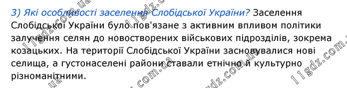 3) Які особливості заселення Слобідської України? Заселення Слобідської України було пов'язане з активним впливом політики залучення селян до новостворених військових підрозділів, зокрема козацьких. На території Слобідської України засновувалися нові селища, а густонаселені райони ставали етнічно й культурно різноманітними.