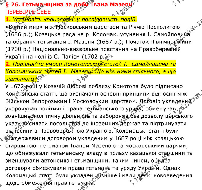 § 26. Гетьманщина за доби Івана Мазепи ПЕРЕВІРТЕ СЕБЕ 1. Установіть хронологічну послідовність подій. «Вічний мир» між Московським царством та Річчю Посполитою (1686 р.); Козацька рада на р. Коломак, усунення I. Самойловича та обрання гетьманом I. Мазепи (1687 р.); Початок Північної війни (1700 р.) Національно-визвольне повстання на Правобережній Україні на чолі із С. Палієм (1702 р.). 2. Порівняйте умови Конотопських статей І. Самойловича та Коломацьких статей І. Мазепи. Що між ними спільного, а що відмінного? У 1672 році у Козачій Діброві поблизу Конотопа було підписано Конотопські статті, що визначали основні принципи відносин між Військом Запорозьким і Московським царством. Договір укладений укорочував політичні права гетьманського уряду, обмежував зовнішньополітичну діяльність та забороняв без дозволу царського указу висилати посольства до іноземних держав та підтримувати відносини з Правобережною Україною. Коломацькі статті були міждержавним договором укладеним у 1687 році між козацькою старшиною, гетьманом Іваном Мазепою та московськими царями, що обмежували гетьманську владу в пользу казацької старшини та зменшували автономію Гетьманщини. Таким чином, обидва договори обмежували права гетьмана та уряду України. Однак Коломацькі статті були укладені пізніше і мали деякі нововведення щодо обмеження прав гетьмана.