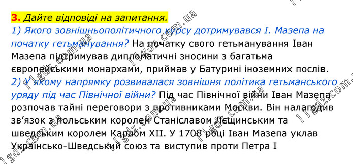 Дайте відповіді на запитання. 1) Якого зовнішньополітичного курсу дотримувався І. Мазепа на початку гетьманування? На початку свого гетьманування Іван Мазепа підтримував дипломатичні зносини з багатьма європейськими монархами, приймав у Батурині іноземних послів. 2) У якому напрямку розвивалася зовнішня політика гетьманського уряду під час Північної війни? Під час Північної війни Іван Мазепа розпочав тайні переговори з противниками Москви. Він налагодив зв’язок з польським королем Станіславом Лєщинським та шведським королем Карлом XII. У 1708 році Іван Мазепа уклав Українсько-Шведський союз та виступив проти Петра І