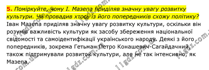 Поміркуйте, чому І. Мазепа приділяв значну увагу розвитку культури. Чи провадив хтось із його попередників схожу політику? Іван Мазепа приділяв значну увагу розвитку культури, оскільки він розумів важливість культури як засобу збереження національної свідомості та самоідентифікації українського народу. Деякі з його попередників, зокрема Гетьман Петро Конашевич-Сагайдачний, також підтримували розвиток культури, але не так інтенсивно, як Мазепа.