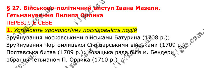§ 27. Військово-політичний виступ Івана Мазепи. Гетьманування Пилипа Орлика ПЕРЕВІРТЕ СЕБЕ 1. Установіть хронологічну послідовність подій Зруйнування московськими військами Батурина (1708 р.); Зруйнування Чортомлицької Січі царськими військами (1709 р.); Полтавська битва (1709 р.); Козацька рада біля м. Бендери, обрання гетьманом П. Орлика (1710 р.)