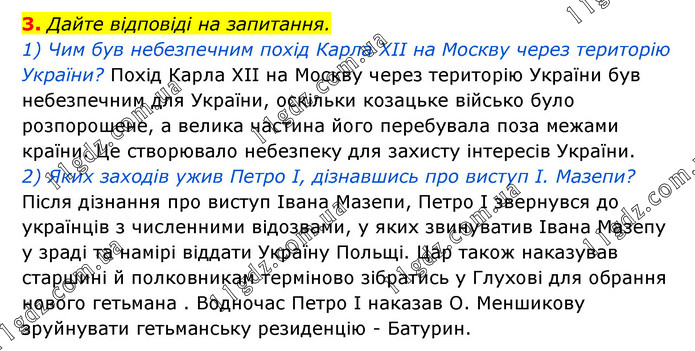 Дайте відповіді на запитання. 1) Чим був небезпечним похід Карла ХІІ на Москву через територію України? Похід Карла ХІІ на Москву через територію України був небезпечним для України, оскільки козацьке військо було розпорошене, а велика частина його перебувала поза межами країни. Це створювало небезпеку для захисту інтересів України. 2) Яких заходів ужив Петро I, дізнавшись про виступ І. Мазепи? Після дізнання про виступ Івана Мазепи, Петро I звернувся до українців з численними відозвами, у яких звинуватив Івана Мазепу у зраді та намірі віддати Україну Польщі. Цар також наказував старшині й полковникам терміново зібратись у Глухові для обрання нового гетьмана . Водночас Петро I наказав О. Меншикову зруйнувати гетьманську резиденцію - Батурин.