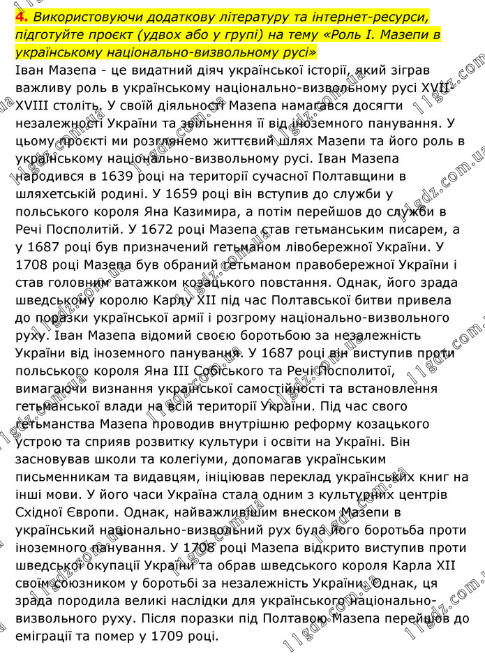 Використовуючи додаткову літературу та інтернет-ресурси, підготуйте проєкт (удвох або у групі) на тему «Роль І. Мазепи в українському національно-визвольному русі» Іван Мазепа - це видатний діяч української історії, який зіграв важливу роль в українському національно-визвольному русі XVII-XVIII століть. У своїй діяльності Мазепа намагався досягти незалежності України та звільнення її від іноземного панування. У цьому проєкті ми розглянемо життєвий шлях Мазепи та його роль в українському національно-визвольному русі. Іван Мазепа народився в 1639 році на території сучасної Полтавщини в шляхетській родині. У 1659 році він вступив до служби у польського короля Яна Казимира, а потім перейшов до служби в Речі Посполитій. У 1672 році Мазепа став гетьманським писарем, а у 1687 році був призначений гетьманом лівобережної України. У 1708 році Мазепа був обраний гетьманом правобережної України і став головним ватажком козацького повстання. Однак, його зрада шведському королю Карлу XII під час Полтавської битви привела до поразки української армії і розгрому національно-визвольного руху. Іван Мазепа відомий своєю боротьбою за незалежність України від іноземного панування. У 1687 році він виступив проти польського короля Яна III Собіського та Речі Посполитої, вимагаючи визнання української самостійності та встановлення гетьманської влади на всій території України. Під час свого гетьманства Мазепа проводив внутрішню реформу козацького устрою та сприяв розвитку культури і освіти на Україні. Він засновував школи та колегіуми, допомагав українським письменникам та видавцям, ініціював переклад українських книг на інші мови. У його часи Україна стала одним з культурних центрів Східної Європи. Однак, найважливішим внеском Мазепи в український національно-визвольний рух була його боротьба проти іноземного панування. У 1708 році Мазепа відкрито виступив проти шведської окупації України та обрав шведського короля Карла XII своїм союзником у боротьбі за незалежність України. Однак, ця зрада породила великі наслідки для українського національно-визвольного руху. Після поразки під Полтавою Мазепа перейшов до еміграції та помер у 1709 році.