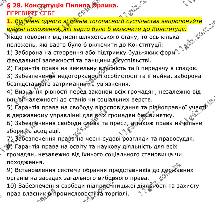 § 28. Конституція Пилипа Орлика. ПЕРЕВІРТЕ СЕБЕ 1. Від імені одного зі станів тогочасного суспільства запропонуйте власні положення, які варто було б включити до Конституції. Якщо говорити від імені шляхетського стану, то ось кілька положень, які варто було б включити до Конституції: 1) Заборона на створення або підтримку будь-яких форм феодальної залежності та панщини в суспільстві. 2) Гарантія права на земельну власність та її передачу в спадок. 3) Забезпечення недоторканості особистості та її майна, заборона безпідставного затримання та ув'язнення. 4) Визнання рівності перед законом всіх громадян, незалежно від їхньої належності до станів чи соціальних верств. 5) Гарантія права на свободу віросповідання та рівноправної участі в державному управлінні для всіх громадян без винятку. 6) Забезпечення свободи слова та преси, а також права на вільне збори та асоціації. 7) Забезпечення права на чесні судові розгляди та правосуддя. 8) Гарантія права на освіту та наукову діяльність для всіх громадян, незалежно від їхнього соціального становища чи походження. 9) Встановлення системи обрання представників до державних органів на засадах загального виборчого права. 10) Забезпечення свободи підприємницької діяльності та захисту прав власників промисловості та торгівлі.