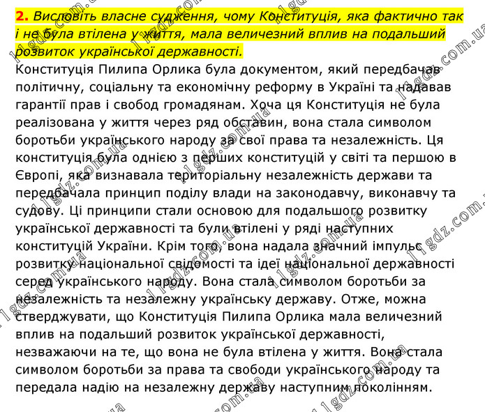 Висловіть власне судження, чому Конституція, яка фактично так і не була втілена у життя, мала величезний вплив на подальший розвиток української державності. Конституція Пилипа Орлика була документом, який передбачав політичну, соціальну та економічну реформу в Україні та надавав гарантії прав і свобод громадянам. Хоча ця Конституція не була реалізована у життя через ряд обставин, вона стала символом боротьби українського народу за свої права та незалежність. Ця конституція була однією з перших конституцій у світі та першою в Європі, яка визнавала територіальну незалежність держави та передбачала принцип поділу влади на законодавчу, виконавчу та судову. Ці принципи стали основою для подальшого розвитку української державності та були втілені у ряді наступних конституцій України. Крім того, вона надала значний імпульс розвитку національної свідомості та ідеї національної державності серед українського народу. Вона стала символом боротьби за незалежність та незалежну українську державу. Отже, можна стверджувати, що Конституція Пилипа Орлика мала величезний вплив на подальший розвиток української державності, незважаючи на те, що вона не була втілена у життя. Вона стала символом боротьби за права та свободи українського народу та передала надію на незалежну державу наступним поколінням.