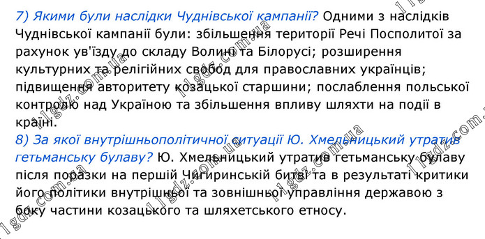 7) Якими були наслідки Чуднівської кампанії? Одними з наслідків Чуднівської кампанії були: збільшення території Речі Посполитої за рахунок ув'їзду до складу Волині та Білорусі; розширення культурних та релігійних свобод для православних українців; підвищення авторитету козацької старшини; послаблення польської контролю над Україною та збільшення впливу шляхти на події в країні. 8) За якої внутрішньополітичної ситуації Ю. Хмельницький утратив гетьманську булаву? Ю. Хмельницький утратив гетьманську булаву після поразки на першій Чигиринській битві та в результаті критики його політики внутрішньої та зовнішньої управління державою з боку частини козацького та шляхетського етносу.