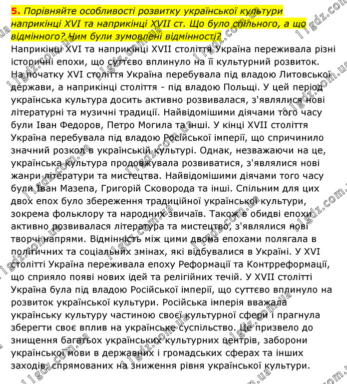 Порівняйте особливості розвитку української культури наприкінці XVI та наприкінці XVII ст. Що було спільного, а що відмінного? Чим були зумовлені відмінності? Наприкінці XVI та наприкінці XVII століття Україна переживала різні історичні епохи, що суттєво вплинуло на її культурний розвиток. На початку XVI століття Україна перебувала під владою Литовської держави, а наприкінці століття - під владою Польщі. У цей період українська культура досить активно розвивалася, з'являлися нові літературні та музичні традиції. Найвідомішими діячами того часу були Іван Федоров, Петро Могила та інші. У кінці XVII століття Україна перебувала під владою Російської імперії, що спричинило значний розкол в українській культурі. Однак, незважаючи на це, українська культура продовжувала розвиватися, з'являлися нові жанри літератури та мистецтва. Найвідомішими діячами того часу були Іван Мазепа, Григорій Сковорода та інші. Спільним для цих двох епох було збереження традиційної української культури, зокрема фольклору та народних звичаїв. Також в обидві епохи активно розвивалася література та мистецтво, з'являлися нові творчі напрями. Відмінність між цими двома епохами полягала в політичних та соціальних змінах, які відбувалися в Україні. У XVI столітті Україна переживала епоху Реформації та Контрреформації, що сприяло появі нових ідей та релігійних течій. У XVII столітті Україна була під владою Російської імперії, що суттєво вплинуло на розвиток української культури. Російська імперія вважала українську культуру частиною своєї культурної сфери і прагнула зберегти своє вплив на українське суспільство. Це призвело до знищення багатьох українських культурних центрів, заборони української мови в державних і громадських сферах та інших заходів, спрямованих на зниження рівня української культури.