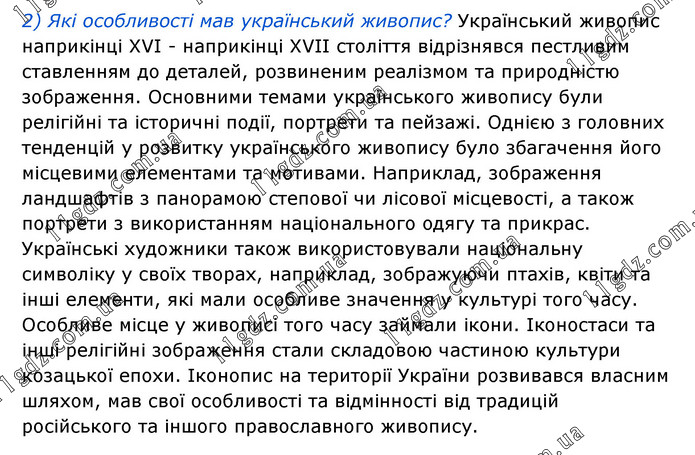 2) Які особливості мав український живопис? Український живопис наприкінці XVI - наприкінці XVII століття відрізнявся пестливим ставленням до деталей, розвиненим реалізмом та природністю зображення. Основними темами українського живопису були релігійні та історичні події, портрети та пейзажі. Однією з головних тенденцій у розвитку українського живопису було збагачення його місцевими елементами та мотивами. Наприклад, зображення ландшафтів з панорамою степової чи лісової місцевості, а також портрети з використанням національного одягу та прикрас. Українські художники також використовували національну символіку у своїх творах, наприклад, зображуючи птахів, квіти та інші елементи, які мали особливе значення у культурі того часу. Особливе місце у живописі того часу займали ікони. Іконостаси та інші релігійні зображення стали складовою частиною культури козацької епохи. Іконопис на території України розвивався власним шляхом, мав свої особливості та відмінності від традицій російського та іншого православного живопису.