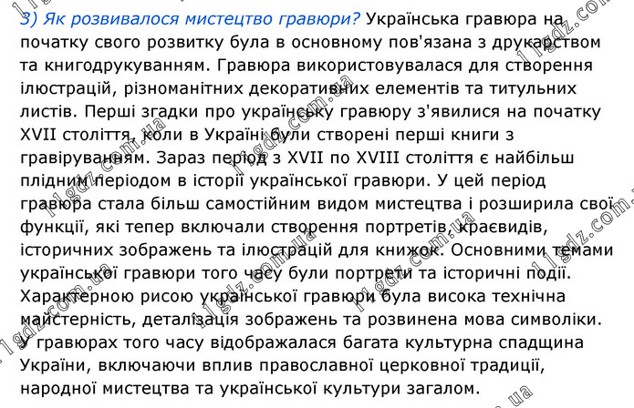 3) Як розвивалося мистецтво гравюри? Українська гравюра на початку свого розвитку була в основному пов'язана з друкарством та книгодрукуванням. Гравюра використовувалася для створення ілюстрацій, різноманітних декоративних елементів та титульних листів. Перші згадки про українську гравюру з'явилися на початку XVII століття, коли в Україні були створені перші книги з гравіруванням. Зараз період з XVII по XVIII століття є найбільш плідним періодом в історії української гравюри. У цей період гравюра стала більш самостійним видом мистецтва і розширила свої функції, які тепер включали створення портретів, краєвидів, історичних зображень та ілюстрацій для книжок. Основними темами української гравюри того часу були портрети та історичні події. Характерною рисою української гравюри була висока технічна майстерність, деталізація зображень та розвинена мова символіки. У гравюрах того часу відображалася багата культурна спадщина України, включаючи вплив православної церковної традиції, народної мистецтва та української культури загалом.
