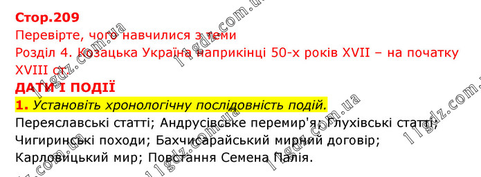 Перевірте, чого навчилися з теми Розділ 4. Козацька Україна наприкінці 50-х років ХVІІ – на початку ХVІІІ ст. ДАТИ І ПОДІЇ 1. Установіть хронологічну послідовність подій. Переяславські статті; Андрусівське перемир'я; Глухівські статті; Чигиринські походи; Бахчисарайський мирний договір; Карловицький мир; Повстання Семена Палія.