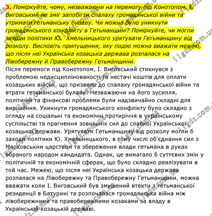3. Поміркуйте, чому, незважаючи на перемогу під Конотопом, І. Виговський не зміг запобігти спалаху громадянської війни та утримати гетьманську булаву. Чи можна було уникнути громадянського конфлікту в Гетьманщині? Поміркуйте, чи могли заходи політики Ю. Хмельницького урятувати Гетьманщину від розколу. Висловіть припущення, яку подію можна вважати межею, що після неї Українська козацька держава розпалася на Лівобережну й Правобережну Гетьманщини. Після перемоги під Конотопом, І. Виговський стикнувся з проблемою недисциплінованості та нестачі коштів для оплати козацьких військ, що призвело до спалаху громадянської війни та втрати гетьманської булави. Незважаючи на його зусилля, політичні та фінансові проблеми були надзвичайно складні для вирішення. Уникнути громадянського конфлікту було складно з огляду на соціальні та економічні протиріччя в українському суспільстві та прагнення зовнішніх сил до слабкої Української козацької держави. Урятувати Гетьманщину від розколу могли б заходи політики Ю. Хмельницького, в тому числі об'єднання сил з Московським царством та збереження влади гетьмана в руках обраного народом кандидата. Однак, це вимагало б суттєвих змін у політичній та економічній сферах, що було складно реалізувати в той час. Межею, що після неї Українська козацька держава розпалася на Лівобережну та Правобережну Гетьманщини, можна вважати коли І. Виговський був змушений втекти з гетьманської резиденції в Батурині та розпочалася громадянська війна між лівобережними та правобережними козаками за владу в Українській козацькій державі.
