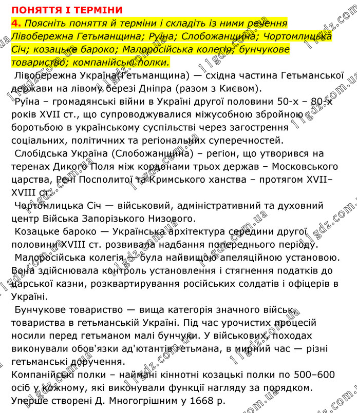 ПОНЯТТЯ І ТЕРМІНИ 4. Поясніть поняття й терміни і складіть із ними речення Лівобережна Гетьманщина; Руїна; Слобожанщина; Чортомлицька Січ; козацьке бароко; Малоросійська колегія; бунчукове товариство; компанійські полки. Лівобережна Україна(Гетьманщина) — східна частина Гетьманської держави на лівому березі Дніпра (разом з Києвом). Руїна – громадянські війни в Україні другої половини 50-х – 80-х років XVII ст., що супроводжувалися міжусобною збройною боротьбою в українському суспільстві через загострення соціальних, політичних та регіональних суперечностей. Слобідська Україна (Слобожанщина) – регіон, що утворився на теренах Дикого Поля між кордонами трьох держав – Московського царства, Речі Посполитої та Кримського ханства – протягом XVII–XVIII ст. Чортомлицька Січ — військовий, адміністративний та духовний центр Війська Запорізького Низового. Козацьке бароко — Українська архітектура середини другої половини XVIII ст. розвивала надбання попереднього періоду. Малоросійська колегія — була найвищою апеляційною установою. Вона здійснювала контроль установлення і стягнення податків до царської казни, розквартирування російських солдатів і офіцерів в Україні. Бунчукове товариство — вища категорія значного військ, товариства в гетьманській Україні. Під час урочистих процесій носили перед гетьманом малі бунчуки. У військових, походах виконували обов'язки ад'ютантів гетьмана, в мирний час — різні гетьманські доручення. Компанійські полки – наймані кіннотні козацькі полки по 500–600 осіб у кожному, які виконували функції нагляду за порядком. Уперше створені Д. Многогрішним у 1668 р.