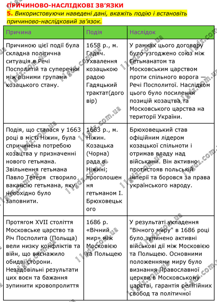 ПРИЧИНОВО-НАСЛІДКОВІ ЗВ’ЯЗКИ 5. Використовуючи наведені дані, вкажіть подію і встановіть причиново-наслідковий зв’язок. Причина Подія Наслідок Причиною цієї події була складна політична ситуація в Речі Посполитій та суперечки між різними групами козацького стану. 1658 р., м. Гадяч. Ухвалення козацькою радою Гадяцький трактат(договір) У рамках цього договору було узгоджено союз між Гетьманатом та Московським царством проти спільного ворога — Речі Посполитої. Наслідком цього було посилення позицій козацтва та Московського царства на території України. Подія, що сталася у 1663 році в місті Ніжин, була спричинена потребою козацтва у призначенні нового гетьмана. Звільнення гетьмана Павло Тетеря створило вакансію гетьмана, яку необхідно було заповнити. 1663 р., м. Ніжин. Козацька (Чорна) рада в Ніжині; проголошення гетьманом І. Брюховецького Брюховецький став офіційним лідером козацької спільноти і отримав владу над військами. Він активно протистояв польській імперії та боровся за права українського народу. Протягом XVII століття Московське царство та Річ Посполита (Польща) вели низку конфліктів та війн, що виснажило обидві сторони. Незадовільні результати цих воєн та бажання зупинити кровопролиття спричинили необхідність укладання миру. 1686 р. «Вічний мир» між Московією та Польщею У результаті укладення "Вічного миру" в 1686 році було зупинено активні військові дії між Московією та Польщею. Основними положеннями миру було визнання Православної церкви в Московському царстві, гарантія релігійних свобод та політичної автономії українського населення.
