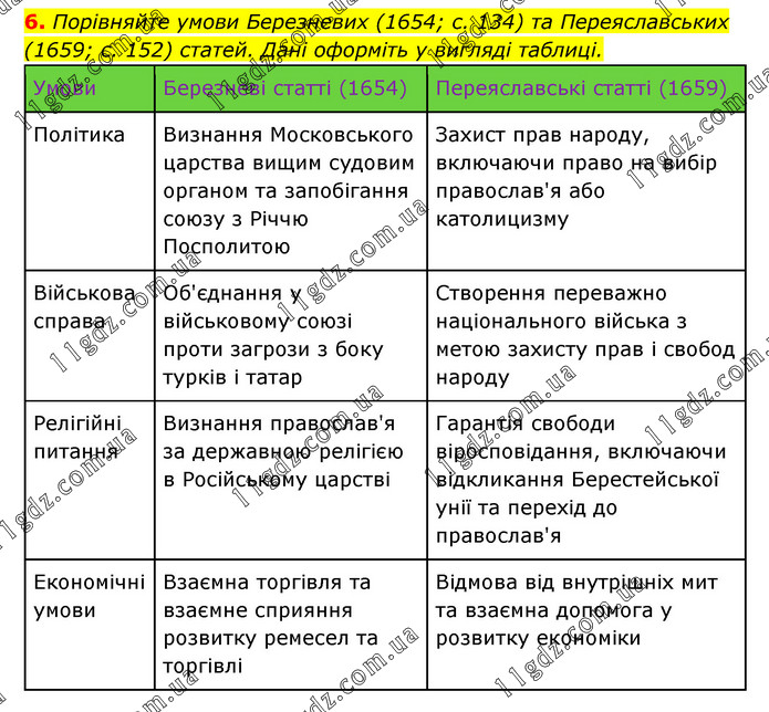 Порівняйте умови Березневих (1654; с. 134) та Переяславських (1659; с. 152) статей. Дані оформіть у вигляді таблиці. Умови Березневі статті (1654) Переяславські статті (1659) Політика Визнання Московського царства вищим судовим органом та запобігання союзу з Річчю Посполитою Захист прав народу, включаючи право на вибір православ'я або католицизму Військова справа Об'єднання у військовому союзі проти загрози з боку турків і татар Створення переважно національного війська з метою захисту прав і свобод народу Релігійні питання Визнання православ'я за державною релігією в Російському царстві Гарантія свободи віросповідання, включаючи відкликання Берестейської унії та перехід до православ'я Економічні умови Взаємна торгівля та взаємне сприяння розвитку ремесел та торгівлі Відмова від внутрішніх мит та взаємна допомога у розвитку економіки