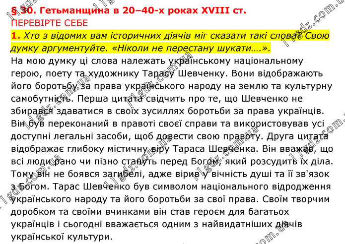 § 30. Гетьманщина в 20–40-х роках XVIII ст. ПЕРЕВІРТЕ СЕБЕ 1. Хто з відомих вам історичних діячів міг сказати такі слова? Свою думку аргументуйте. «Ніколи не перестану шукати….». На мою думку ці слова належать українському національному герою, поету та художнику Тарасу Шевченку. Вони відображають його боротьбу за права українського народу на землю та культурну самобутність. Перша цитата свідчить про те, що Шевченко не збирався здаватися в своїх зусиллях боротьби за права українців. Він був переконаний в правоті своєї справи та використовував усі доступні легальні засоби, щоб довести свою правоту. Друга цитата відображає глибоку містичну віру Тараса Шевченка. Він вважав, що всі люди рано чи пізно стануть перед Богом, який розсудить їх діла. Тому він не боявся загибелі, адже вірив у вічність душі та її зв'язок з Богом. Тарас Шевченко був символом національного відродження українського народу та його боротьби за свої права. Своїм творчим доробком та своїми вчинками він став героєм для багатьох українців і сьогодні вважається одним з найвидатніших діячів української культури.