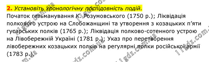 Установіть хронологічну послідовність подій. Початок гетьманування К. Розумовського (1750 р.); Ліквідація полкового устрою на Слобожанщині та утворення з козацьких п’яти гусарських полків (1765 р.); Ліквідація полково-сотенного устрою на Лівобережній Україні (1781 р.); Указ про перетворення лівобережних козацьких полків на регулярні полки російської армії (1783 р.).