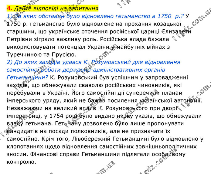 Дайте відповіді на запитання 1) За яких обставин було відновлено гетьманство в 1750 р.? У 1750 р. гетьманство було відновлене на прохання козацької старшини, що українське оточення російської цариці Єлизавети Петрівни зіграло важливу роль. Російська влада бажала використовувати потенціал України у майбутніх війнах з Туреччиною та Прусією. 2) До яких заходів удався К. Розумовський для відновлення самостійної роботи державно-адміністративних органів Гетьманщини? К. Розумовський був успішним у запровадженні заходів, що обмежували сваволю російських чиновників, які перебували в Україні. Його самостійні дії суперечили планам імперського уряду, який не бажав посилення української автономії. Незважаючи на великий вплив К. Розумовського при дворі імператриці, у 1754 році було видано низку указів, що обмежували владу гетьмана. Гетьману дозволено було лише пропонувати кандидатів на посади полковників, але не призначати їх самостійно. Крім того, Лівобережній Гетьманщині було відмовлено у клопотаннях щодо відновлення самостійних зовнішньополітичних зносин. Фінансові справи Гетьманщини підлягали особливому контролю.