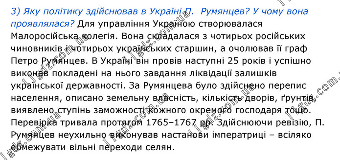 3) Яку політику здійснював в Україні П. Румянцев? У чому вона проявлялася? Для управління Україною створювалася Малоросійська колегія. Вона складалася з чотирьох російських чиновників і чотирьох українських старшин, а очолював її граф Петро Румянцев. В Україні він провів наступні 25 років і успішно виконав покладені на нього завдання ліквідації залишків української державності. За Румянцева було здійснено перепис населення, описано земельну власність, кількість дворів, ґрунтів, виявлено ступінь заможності кожного окремого господаря тощо. Перевірка тривала протягом 1765–1767 рр. Здійснюючи ревізію, П. Румянцев неухильно виконував настанови імператриці – всіляко обмежувати вільні переходи селян.