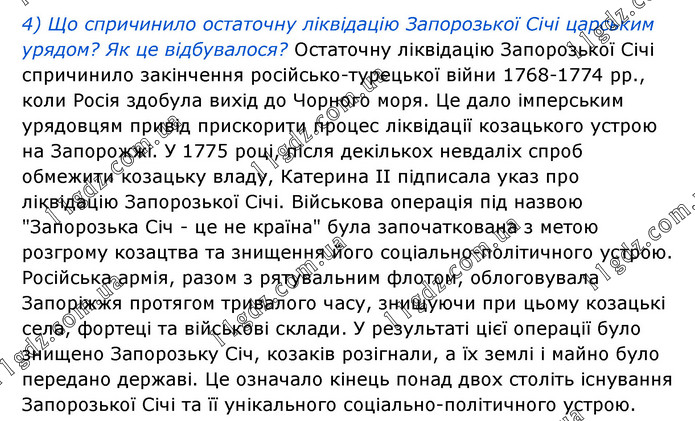 4) Що спричинило остаточну ліквідацію Запорозької Січі царським урядом? Як це відбувалося? Остаточну ліквідацію Запорозької Січі спричинило закінчення російсько-турецької війни 1768-1774 рр., коли Росія здобула вихід до Чорного моря. Це дало імперським урядовцям привід прискорити процес ліквідації козацького устрою на Запорожжі. У 1775 році, після декількох невдаліх спроб обмежити козацьку владу, Катерина II підписала указ про ліквідацію Запорозької Січі. Військова операція під назвою "Запорозька Січ - це не країна" була започаткована з метою розгрому козацтва та знищення його соціально-політичного устрою. Російська армія, разом з рятувальним флотом, облоговувала Запоріжжя протягом тривалого часу, знищуючи при цьому козацькі села, фортеці та військові склади. У результаті цієї операції було знищено Запорозьку Січ, козаків розігнали, а їх землі і майно було передано державі. Це означало кінець понад двох століть існування Запорозької Січі та її унікального соціально-політичного устрою.