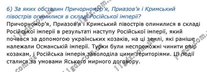 6) За яких обставин Причорномор’я, Приазов’я і Кримський півострів опинилися в складі Російської імперії? Причорномор’я, Приазов’я і Кримський півострів опинилися в складі Російської імперії в результаті наступу Російської імперії, який почався за допомогою українських козаків, на ці землі, які раніше належали Османській імперії. Турки були неспроможні чинити опір козакам, і Російська імперія заволоділа цими територіями. Ці події сталися за умовами Яського мирного договору.