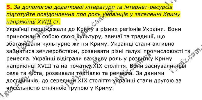 За допомогою додаткової літератури та інтернет-ресурсів підготуйте повідомлення про роль українців у заселенні Криму наприкінці XVIII ст. Українці переїжджали до Криму з різних регіонів України. Вони приносили з собою свою культуру, звичаї та традиції, що збагачували культурне життя Криму. Українці стали активно займатися землеробством, розвивати різні галузі промисловості та ремесла. Українці відіграли важливу роль у розвитку Криму наприкінці XVIII та на початку XIX століття. Вони заснували нові села та міста, розвивали торгівлю та ремесла. За даними дослідників, до середини XIX століття українці стали другою за чисельністю етнічною групою у Криму.