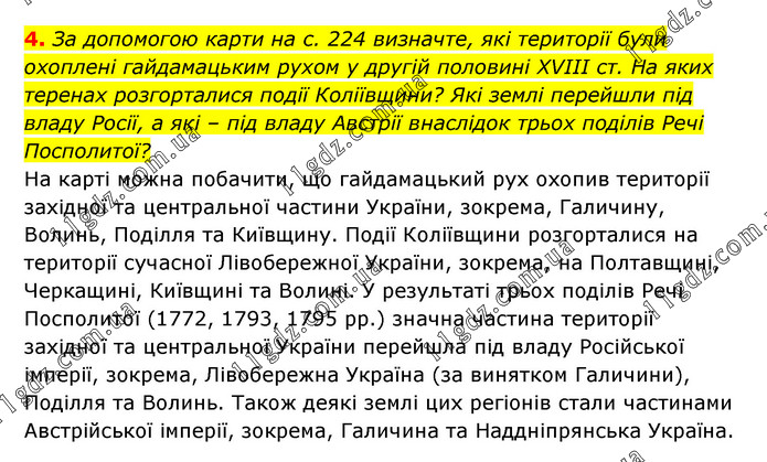 За допомогою карти на с. 224 визначте, які території були охоплені гайдамацьким рухом у другій половині XVIII ст. На яких теренах розгорталися події Коліївщини? Які землі перейшли під владу Росії, а які – під владу Австрії внаслідок трьох поділів Речі Посполитої? На карті можна побачити, що гайдамацький рух охопив території західної та центральної частини України, зокрема, Галичину, Волинь, Поділля та Київщину. Події Коліївщини розгорталися на території сучасної Лівобережної України, зокрема, на Полтавщині, Черкащині, Київщині та Волині. У результаті трьох поділів Речі Посполитої (1772, 1793, 1795 рр.) значна частина території західної та центральної України перейшла під владу Російської імперії, зокрема, Лівобережна Україна (за винятком Галичини), Поділля та Волинь. Також деякі землі цих регіонів стали частинами Австрійської імперії, зокрема, Галичина та Наддніпрянська Україна.