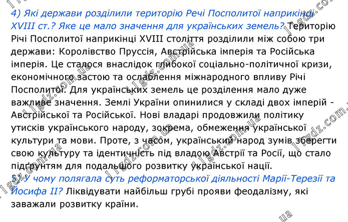 4) Які держави розділили територію Речі Посполитої наприкінці XVIII ст.? Яке це мало значення для українських земель? Територію Річі Посполитої наприкінці XVIII століття розділили між собою три держави: Королівство Пруссія, Австрійська імперія та Російська імперія. Це сталося внаслідок глибокої соціально-політичної кризи, економічного застою та ослаблення міжнародного впливу Річі Посполитої. Для українських земель це розділення мало дуже важливе значення. Землі України опинилися у складі двох імперій - Австрійської та Російської. Нові владарі продовжили політику утисків українського народу, зокрема, обмеження української культури та мови. Проте, з часом, український народ зумів зберегти свою культуру та ідентичність під владою Австрії та Росії, що стало підґрунтям для подальшого розвитку української нації. 5) У чому полягала суть реформаторської діяльності Марії-Терезії та Йосифа ІІ? Ліквідувати найбільш грубі прояви феодалізму, які заважали розвитку країни.