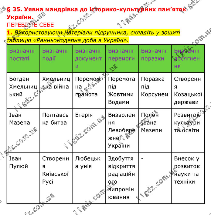 § 35. Уявна мандрівка до історико-культурних пам’яток України. ПЕРЕВІРТЕ СЕБЕ 1. Використовуючи матеріали підручника, складіть у зошиті таблицю «Ранньомодерна доба в Україні». Визначні постаті Визначні події Визначні документи Визначні перемоги Визначні поразки Визначні досягнення Богдан Хмельницький Хмельницька війна Переможна грамота Перемога під Жовтими Водами Поразка під Корсунем Створення Козацької держави Іван Мазепа Полтавська битва Етерія Визволення Левобережної України Полон Івана Мазепи Розвиток культури та освіти Іван Пулюй Створення Київської Русі Любецька унія Здобуття відкриття радіаційного випромінювання - Внесок у розвиток науки та техніки