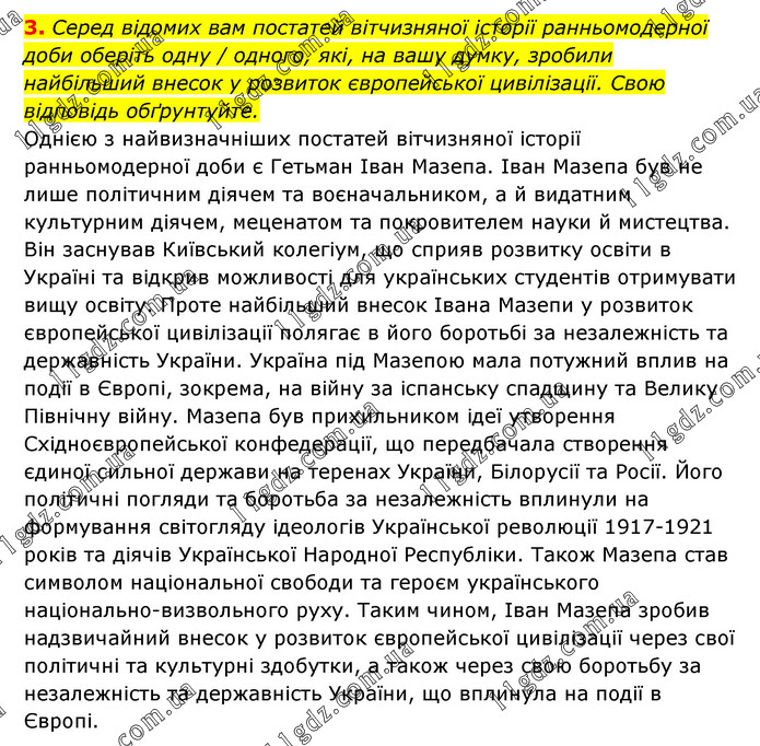 Серед відомих вам постатей вітчизняної історії ранньомодерної доби оберіть одну / одного, які, на вашу думку, зробили найбільший внесок у розвиток європейської цивілізації. Свою відповідь обґрунтуйте. Однією з найвизначніших постатей вітчизняної історії ранньомодерної доби є Гетьман Іван Мазепа. Іван Мазепа був не лише політичним діячем та воєначальником, а й видатним культурним діячем, меценатом та покровителем науки й мистецтва. Він заснував Київський колегіум, що сприяв розвитку освіти в Україні та відкрив можливості для українських студентів отримувати вищу освіту. Проте найбільший внесок Івана Мазепи у розвиток європейської цивілізації полягає в його боротьбі за незалежність та державність України. Україна під Мазепою мала потужний вплив на події в Європі, зокрема, на війну за іспанську спадщину та Велику Північну війну. Мазепа був прихильником ідеї утворення Східноєвропейської конфедерації, що передбачала створення єдиної сильної держави на теренах України, Білорусії та Росії. Його політичні погляди та боротьба за незалежність вплинули на формування світогляду ідеологів Української революції 1917-1921 років та діячів Української Народної Республіки. Також Мазепа став символом національної свободи та героєм українського національно-визвольного руху. Таким чином, Іван Мазепа зробив надзвичайний внесок у розвиток європейської цивілізації через свої політичні та культурні здобутки, а також через свою боротьбу за незалежність та державність України, що вплинула на події в Європі.