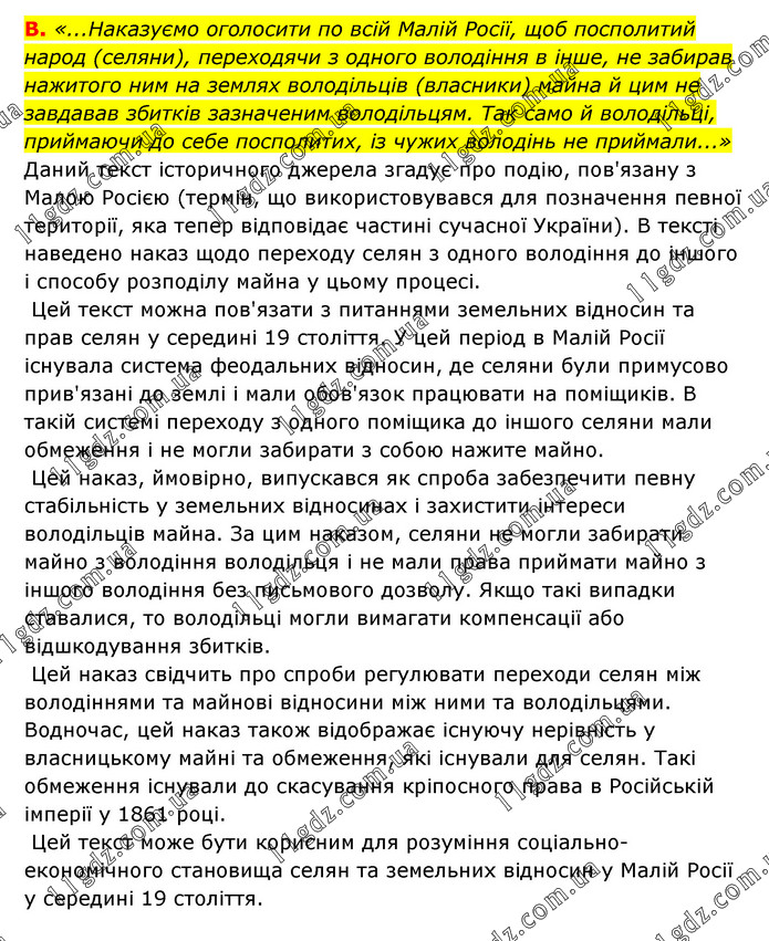 «...Наказуємо оголосити по всій Малій Росії, щоб посполитий народ (селяни), переходячи з одного володіння в інше, не забирав нажитого ним на землях володільців (власники) майна й цим не завдавав збитків зазначеним володільцям. Так само й володільці, приймаючи до себе посполитих, із чужих володінь не приймали...» Даний текст історичного джерела згадує про подію, пов'язану з Малою Росією (термін, що використовувався для позначення певної території, яка тепер відповідає частині сучасної України). В тексті наведено наказ щодо переходу селян з одного володіння до іншого і способу розподілу майна у цьому процесі. Цей текст можна пов'язати з питаннями земельних відносин та прав селян у середині 19 століття. У цей період в Малій Росії існувала система феодальних відносин, де селяни були примусово прив'язані до землі і мали обов'язок працювати на поміщиків. В такій системі переходу з одного поміщика до іншого селяни мали обмеження і не могли забирати з собою нажите майно. Цей наказ, ймовірно, випускався як спроба забезпечити певну стабільність у земельних відносинах і захистити інтереси володільців майна. За цим наказом, селяни не могли забирати майно з володіння володільця і не мали права приймати майно з іншого володіння без письмового дозволу. Якщо такі випадки ставалися, то володільці могли вимагати компенсації або відшкодування збитків. Цей наказ свідчить про спроби регулювати переходи селян між володіннями та майнові відносини між ними та володільцями. Водночас, цей наказ також відображає існуючу нерівність у власницькому майні та обмеження, які існували для селян. Такі обмеження існували до скасування кріпосного права в Російській імперії у 1861 році. Цей текст може бути корисним для розуміння соціально-економічного становища селян та земельних відносин у Малій Росії у середині 19 століття.