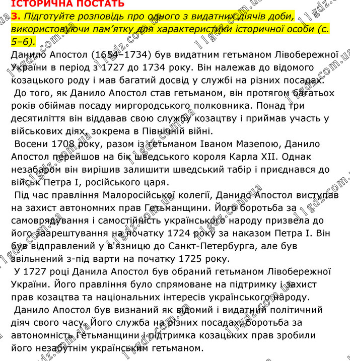 ІСТОРИЧНА ПОСТАТЬ 3. Підготуйте розповідь про одного з видатних діячів доби, використовуючи пам’ятку для характеристики історичної особи (с. 5–6). Данило Апостол (1654–1734) був видатним гетьманом Лівобережної України в період з 1727 до 1734 року. Він належав до відомого козацького роду і мав багатий досвід у службі на різних посадах. До того, як Данило Апостол став гетьманом, він протягом багатьох років обіймав посаду миргородського полковника. Понад три десятиліття він віддавав свою службу козацтву і приймав участь у військових діях, зокрема в Північній війні. Восени 1708 року, разом із гетьманом Іваном Мазепою, Данило Апостол перейшов на бік шведського короля Карла XII. Однак незабаром він вирішив залишити шведський табір і приєднався до військ Петра I, російського царя. Під час правління Малоросійської колегії, Данило Апостол виступав на захист автономних прав Гетьманщини. Його боротьба за самоврядування і самостійність українського народу призвела до його заарештування на початку 1724 року за наказом Петра I. Він був відправлений у в'язницю до Санкт-Петербурга, але був звільнений з-під варти на початку 1725 року. У 1727 році Данила Апостол був обраний гетьманом Лівобережної України. Його правління було спрямоване на підтримку і захист прав козацтва та національних інтересів українського народу. Данило Апостол був визнаний як відомий і видатний політичний діяч свого часу. Його служба на різних посадах, боротьба за автономність Гетьманщини і підтримка козацьких прав зробили його незабутнім українським гетьманом.