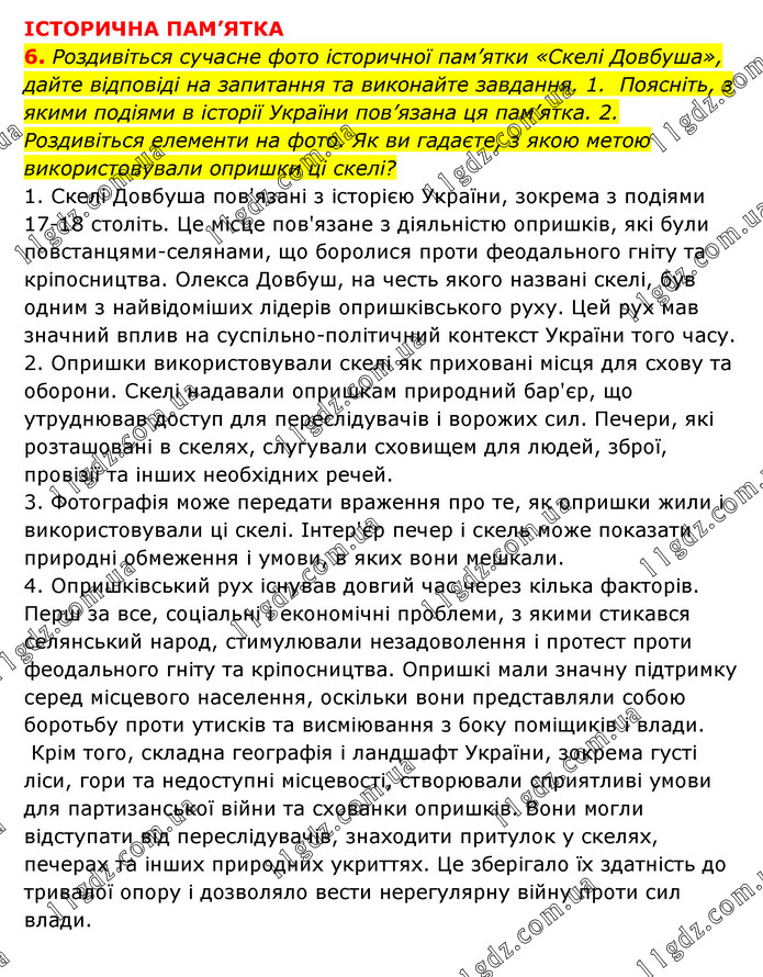 ІСТОРИЧНА ПАМ’ЯТКА 6. Роздивіться сучасне фото історичної пам’ятки «Скелі Довбуша», дайте відповіді на запитання та виконайте завдання. 1. Поясніть, з якими подіями в історії України пов’язана ця пам’ятка. 2. Роздивіться елементи на фото. Як ви гадаєте, з якою метою використовували опришки ці скелі? 1. Скелі Довбуша пов'язані з історією України, зокрема з подіями 17-18 століть. Це місце пов'язане з діяльністю опришків, які були повстанцями-селянами, що боролися проти феодального гніту та кріпосництва. Олекса Довбуш, на честь якого названі скелі, був одним з найвідоміших лідерів опришківського руху. Цей рух мав значний вплив на суспільно-політичний контекст України того часу. 2. Опришки використовували скелі як приховані місця для схову та оборони. Скелі надавали опришкам природний бар'єр, що утруднював доступ для переслідувачів і ворожих сил. Печери, які розташовані в скелях, слугували сховищем для людей, зброї, провізії та інших необхідних речей. 3. Фотографія може передати враження про те, як опришки жили і використовували ці скелі. Інтер'єр печер і скель може показати природні обмеження і умови, в яких вони мешкали. 4. Опришківський рух існував довгий час через кілька факторів. Перш за все, соціальні і економічні проблеми, з якими стикався селянський народ, стимулювали незадоволення і протест проти феодального гніту та кріпосництва. Опришкі мали значну підтримку серед місцевого населення, оскільки вони представляли собою боротьбу проти утисків та висміювання з боку поміщиків і влади. Крім того, складна географія і ландшафт України, зокрема густі ліси, гори та недоступні місцевості, створювали сприятливі умови для партизанської війни та схованки опришків. Вони могли відступати від переслідувачів, знаходити притулок у скелях, печерах та інших природних укриттях. Це зберігало їх здатність до тривалої опору і дозволяло вести нерегулярну війну проти сил влади.