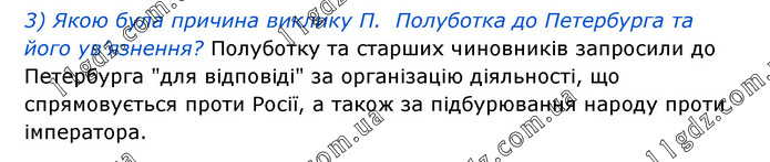 3) Якою була причина виклику П. Полуботка до Петербурга та його ув’язнення? Полуботку та старших чиновників запросили до Петербурга "для відповіді" за організацію діяльності, що спрямовується проти Росії, а також за підбурювання народу проти імператора.