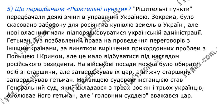 5) Що передбачали «Рішительні пункти»? "Рішительні пункти" передбачали деякі зміни в управлінні Україною. Зокрема, було скасовано заборону для росіян на купівлю земель в Україні, але нові власники мали підпорядковуватися українській адміністрації. Гетьман був позбавлений права на проведення переговорів з іншими країнами, за винятком вирішення прикордонних проблем з Польщею і Кримом, але це мало відбуватися під наглядом російського резидента. На військові посади можна було обирати осіб зі старшини, але затверджував їх цар, а нижчу старшину затверджував гетьман. Найвищою судовою інстанцією став Генеральний суд, який складався з трьох росіян і трьох українців, очолював його гетьман, але "головним суддею" вважався цар.