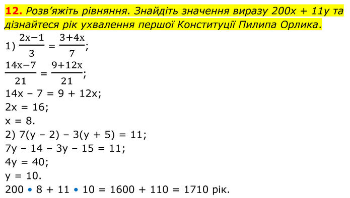 Розв’яжіть рівняння. Знайдіть значення виразу 200х + 11y та дізнайтеся рік ухвалення першої Конституції Пилипа Орлика. 1) (2х-1)/3 = (3+4х)/7; (14х-7)/21 = (9+12х)/21; 14х – 7 = 9 + 12х; 2х = 16; х = 8. 2) 7(у – 2) – 3(у + 5) = 11; 7у – 14 – 3у – 15 = 11; 4у = 40; у = 10. 200 • 8 + 11 • 10 = 1600 + 110 = 1710 рік.