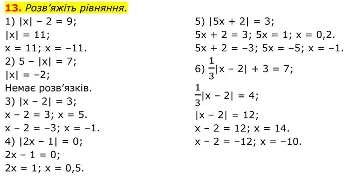 Розв’яжіть рівняння. 1) |x| – 2 = 9; |x| = 11; x = 11; x = –11. 2) 5 – |x| = 7; |x| = –2; Немає розв’язків. 3) |x – 2| = 3; х – 2 = 3; х = 5. х – 2 = –3; х = –1. 4) |2x – 1| = 0; 2х – 1 = 0; 2х = 1; х = 0,5. 5) |5x + 2| = 3; 5х + 2 = 3; 5х = 1; х = 0,2. 5х + 2 = –3; 5х = –5; х = –1. 6) 1/3|x – 2| + 3 = 7; 1/3|x – 2| = 4; |x – 2| = 12; х – 2 = 12; х = 14. х – 2 = –12; х = –10.