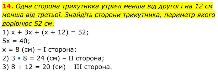 Одна сторона трикутника утричі менша від другої і на 12 см менша від третьої. Знайдіть сторони трикутника, периметр якого дорівнює 52 см. 1) х + 3х + (х + 12) = 52; 5х = 40; х = 8 (см) – І сторона; 2) 3 • 8 = 24 (см) – ІІ сторона; 3) 8 + 12 = 20 (см) – ІІІ сторона.