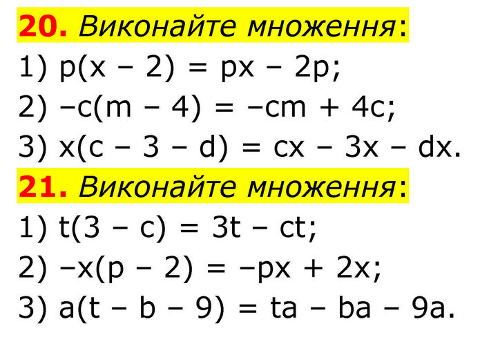 20. Виконайте множення: 1) p(x – 2) = px – 2p; 2) –c(m – 4) = –cm + 4c; 3) x(c – 3 – d) = cx – 3x – dx. 21. Виконайте множення: 1) t(3 – c) = 3t – ct; 2) –x(p – 2) = –px + 2x; 3) a(t – b – 9) = ta – ba – 9a.