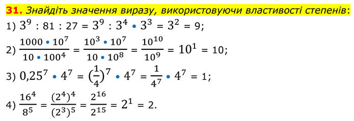 Знайдіть значення виразу, використовуючи властивості степенів: 1) 256 : 2^7 • 8 = 2^8 : 2^7 • 2^3 = 2^4 = 16; 2) (125 • 5^7)/(5^4• 625) = (5^3 • 5^7)/(5^4• 5^4 ) = 5^10/5^8 = 5^2 = 25; 3) 〖0,5〗^9 • 2^9 = 〖(1/2)〗^9 • 2^9 = 1/2^9 • 2^9 = 1; 4) 27^8/81^5 = 3^24/3^20 = 3^4 = 81.