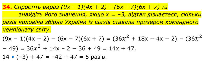 Спростіть вираз (9х – 1)(4х + 2) – (6х – 7)(6х + 7) та знайдіть його значення, якщо х = –3, відтак дізнаєтеся, скільки разів чоловіча збірна України із шахів ставала призером командного чемпіонату світу. (9x − 1)(4x + 2) − (6x − 7)(6x + 7) = (36x^2 + 18x − 4x − 2) − (36x^2 − 49) = 36x^2 + 14x – 2 − 36 + 49 = 14x + 47. 14 • (–3) + 47 = –42 + 47 = 5 разів.