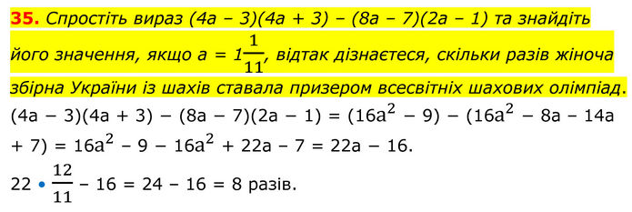 Спростіть вираз (4а – 3)(4а + 3) – (8а – 7)(2а – 1) та знайдіть його значення, якщо а = 11/11, відтак дізнаєтеся, скільки разів жіноча збірна України із шахів ставала призером всесвітніх шахових олімпіад. (4а − 3)(4а + 3) − (8а − 7)(2а − 1) = (16а^2 − 9) − (16а^2 − 8а – 14а + 7) = 16а^2 – 9 − 16а^2 + 22а – 7 = 22а − 16. 22 • 12/11 – 16 = 24 – 16 = 8 разів.
