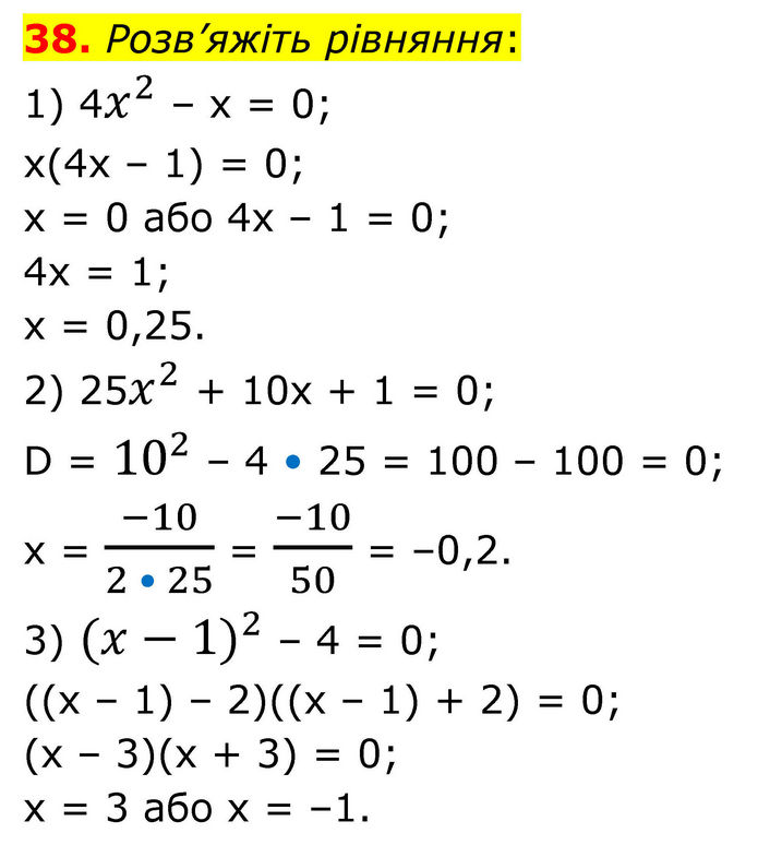 Розв’яжіть рівняння: 1) 4x^2 – x = 0; x(4x – 1) = 0; x = 0 або 4x – 1 = 0; 4x = 1; x = 0,25. 2) 25x^2 + 10x + 1 = 0; D = 10^2 – 4 • 25 = 100 – 100 = 0; x = (-10)/(2 • 25) = (-10)/50 = –0,2. 3) 〖(x-1)〗^2 – 4 = 0; ((x – 1) – 2)((x – 1) + 2) = 0; (x – 3)(x + 3) = 0; x = 3 або х = –1.