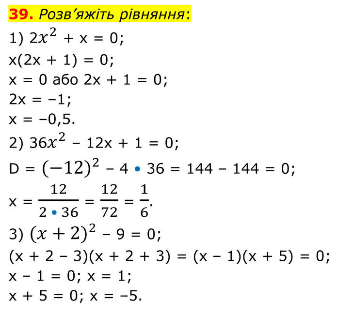 Розв’яжіть рівняння: 1) 2x^2 + x = 0; x(2x + 1) = 0; x = 0 або 2x + 1 = 0; 2x = –1; x = –0,5. 2) 36x^2 – 12x + 1 = 0; D = 〖(-12)〗^2 – 4 • 36 = 144 – 144 = 0; x = 12/(2 • 36) = 12/72 = 1/6. 3) 〖(x+2)〗^2 – 9 = 0; (x + 2 – 3)(x + 2 + 3) = (x – 1)(x + 5) = 0; x – 1 = 0; x = 1; x + 5 = 0; x = –5.