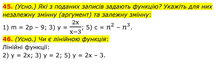 45. Які з поданих записів задають функцію? Укажіть для них незалежну змінну (аргумент) та залежну змінну: 1) m = 2p – 9; 3) y = 2x/(x-3); 5) c = n^2 – n^3. 46. Чи є лінійною функція: Лінійні функції: 2) y = 2x; 3) y = 2; 5) y = 2x – 3.