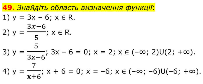 Знайдіть область визначення функції: 1) y = 3x – 6; x ∈ R. 2) y = (3x-6)/5; x ∈ R. 3) y = 5/(3x-6); 3x – 6 = 0; x = 2; x ∈ (–∞; 2)U(2; +∞). 4) y = 7/(x+6); x + 6 = 0; x = –6; x ∈ (–∞; –6)U(–6; +∞).