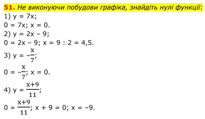 He виконуючи побудови графіка, знайдіть нулі функції: 1) y = 7x; 0 = 7x; x = 0. 2) y = 2x – 9; 0 = 2x – 9; x = 9 : 2 = 4,5. 3) y = –x/7; 0 = –x/7; x = 0. 4) y = (x+9)/11; 0 = (x+9)/11; x + 9 = 0; x = –9.