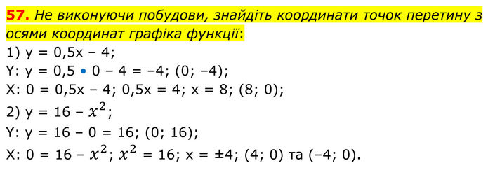He виконуючи побудови, знайдіть координати точок перетину з осями координат графіка функції: 1) у = 0,5х – 4; Y: y = 0,5 • 0 – 4 = –4; (0; –4); X: 0 = 0,5x – 4; 0,5x = 4; x = 8; (8; 0); 2) у = 16 – x^2; Y: y = 16 – 0 = 16; (0; 16); X: 0 = 16 – x^2; x^2 = 16; x = ±4; (4; 0) та (–4; 0).